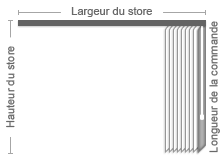 Pendant le montage dans les baies la largeur du store vertical sera d´un côté du mur latérale jusq'à l´autre côté. Nous prenons les mesures du largueur de la baie là où nous installons le store vertical. Nous prenons les mesures de la largueur du store vertical en soustrayant 10 mm de la largeur de la baie à chaque côté.